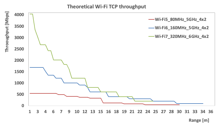 Below we will present a theoretical Range Vs Rate graph of Wi-Fi5, Wi-Fi6 and Wi-Fi7 technologies at their maximum bandwidth capabilities (i.e 80, 160 and 320 MHz) based on modelling following properties for Wi-Fi communication.